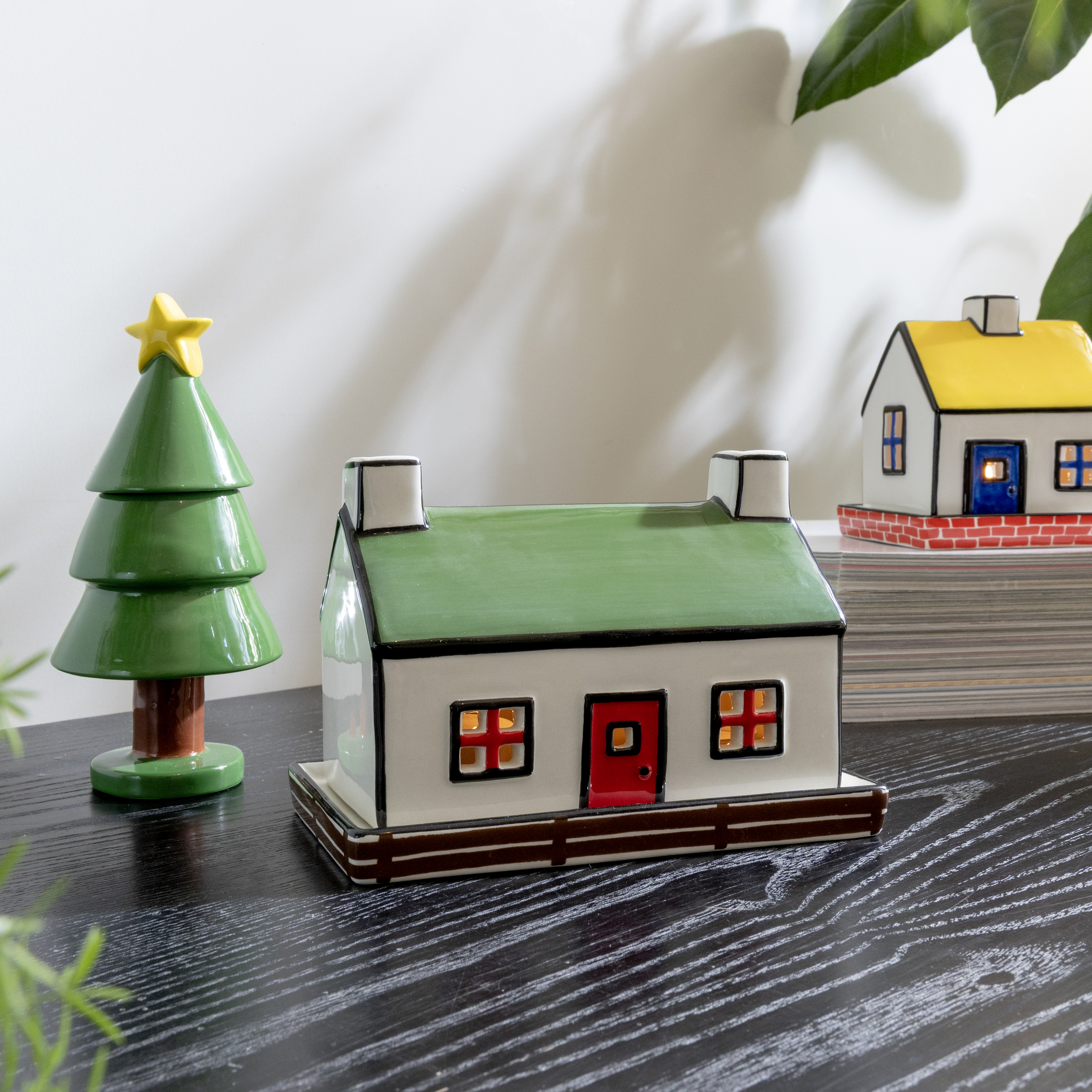 In collaboration with English ceramicist and illustrator Hal Haines, these tree-shaped candle holders bring a playful forest vibe to your home. Crafted from ceramic and hand-painted in vibrant colors, they showcase Haines’ distinctive blend of storytelling and design. Mix & match with Hal Haines’ tealight houses to create your own cheerful miniature village full of light and color.