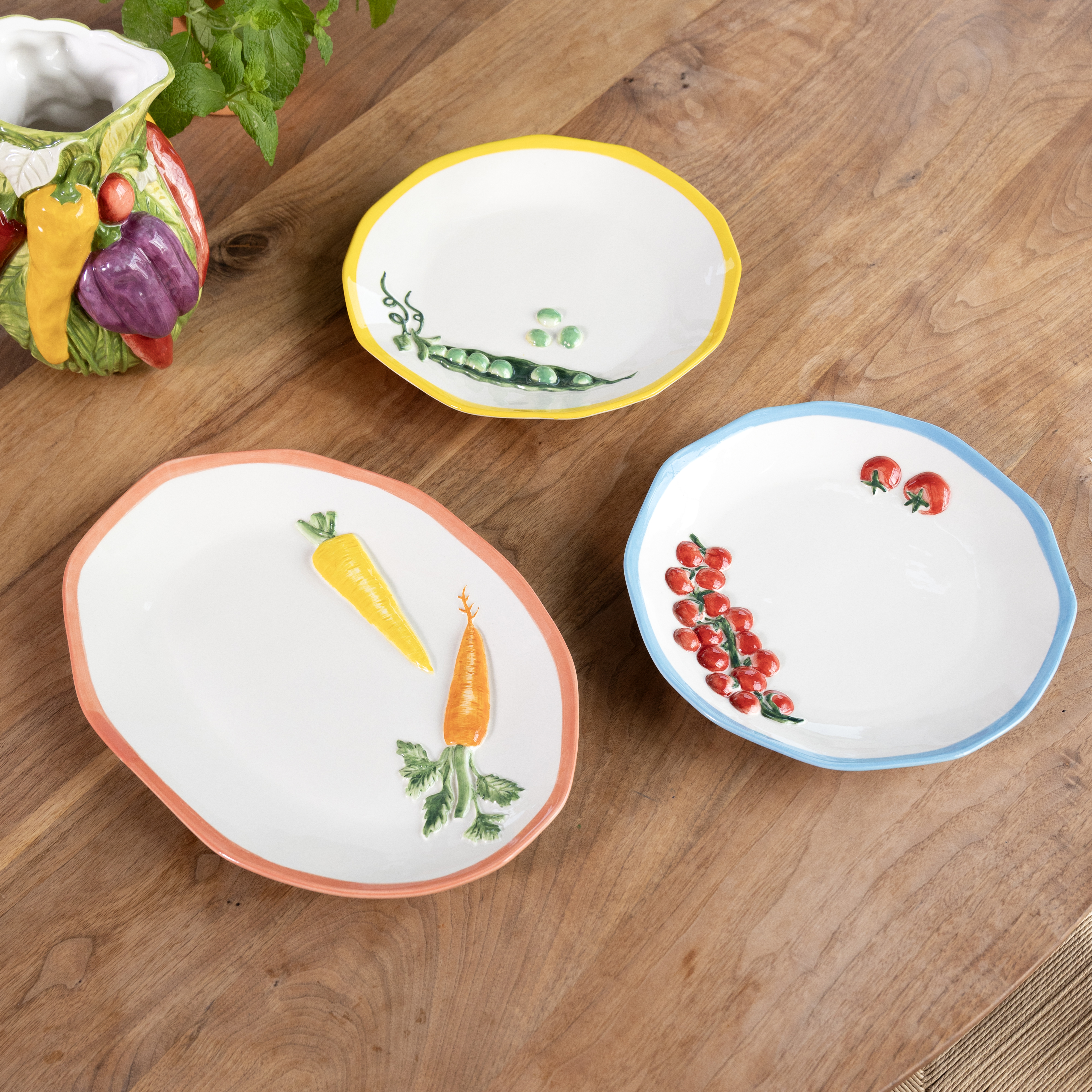 What truly sets this plate apart is its decorative element—a subtle design featuring a carrot, beautifully integrated into the craftsmanship. This delicate detail adds a charming, organic touch to the round plate.
